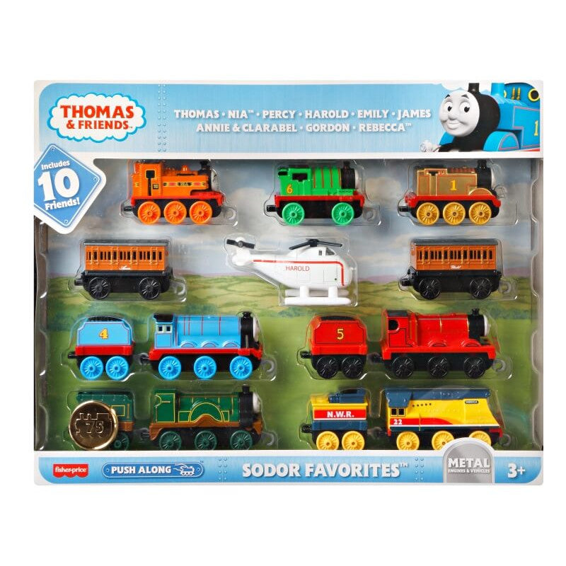 Includes die-cast metal Thomas, Nia, Percy, Rebecca, Gordon, Emily, James, Victor, Kevin and HaroldCreate big adventures with fun, push along engines of the Steam Team and other friends from the Thomas & Friends TV show. Each has a special part to play to help keep the Island of Sodor running! Includes Thomas, Nia, Percy, Rebecca, Gordon, Emily, James, Victor, Kevin and Harold. Push them along TrackMaster tracks to create limitless adventures!