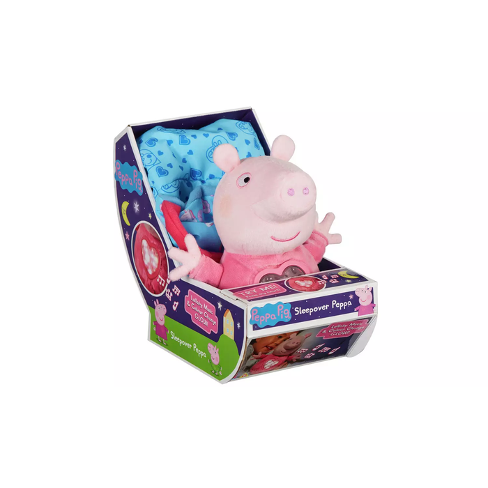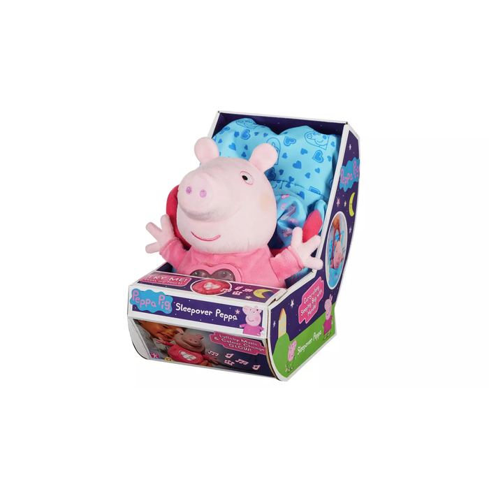 Sleepover Peppa is the perfect bedtime companion! Supersoft and cuddly Peppa Pig toy, wearing pink pyjamas. Press the heart on Peppa's chest to hear a lullaby and see a soft night-light glow. Peppa comes with a cute sleeping bag with carry handle, so you can take her anywhere. Discover the secret compartment in the sleeping bag, a great place to store things like a toothbrush and toothpaste perhaps! For ages 3 years and over.