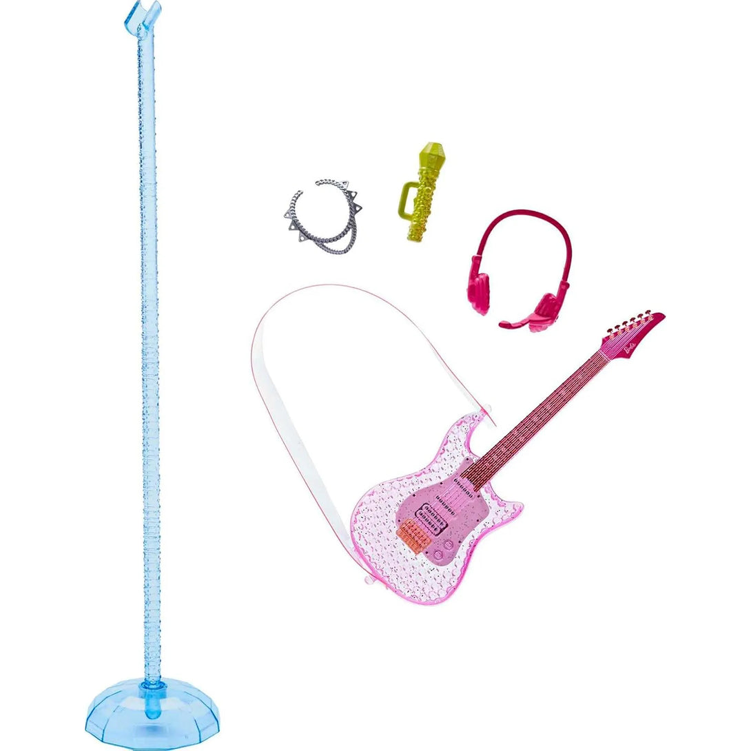 Help her rock out with accessories including a guitar, headset, a microphone with a stand and more!