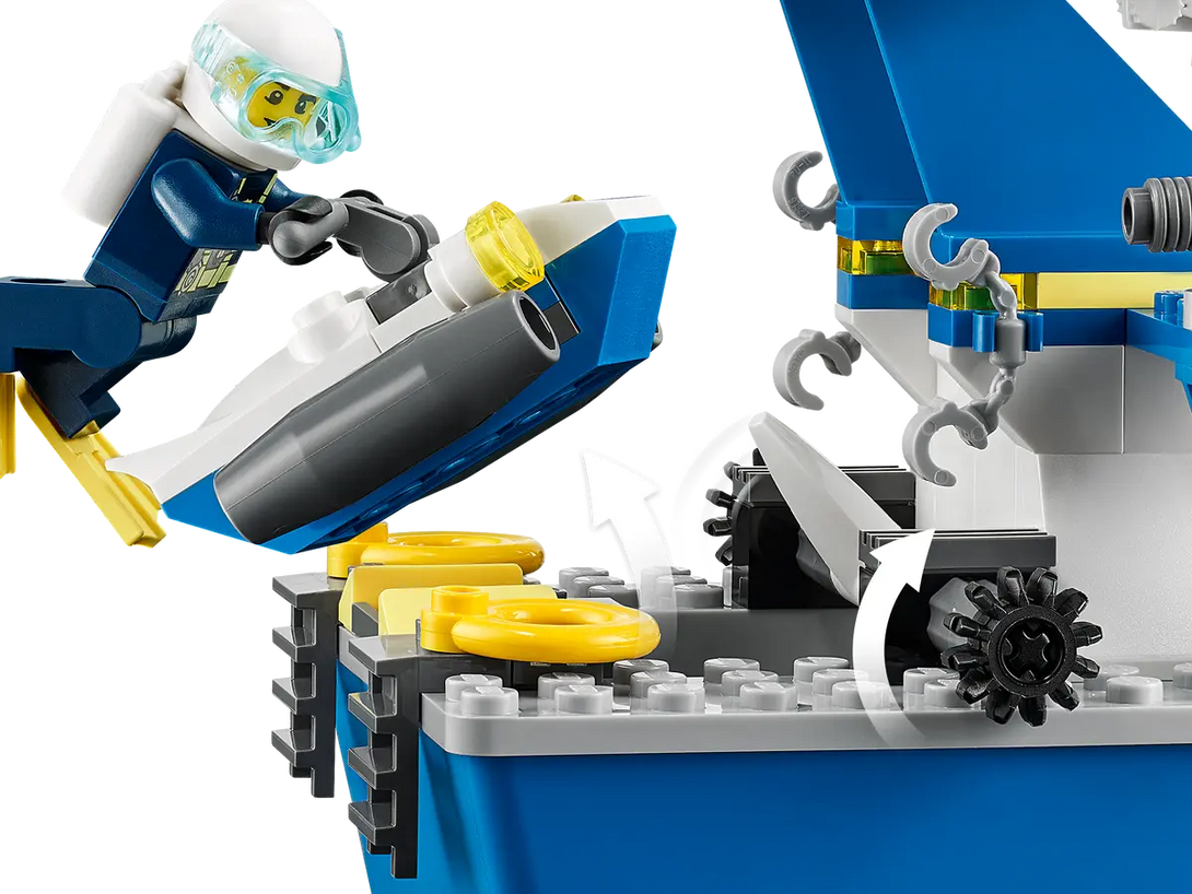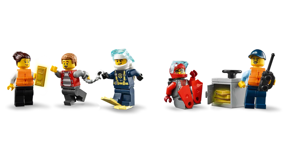 The boat really floats, making it a fantastic choice for water play—maybe even bathtime, if you're feeling brave! The set includes 5 minifigures—including Gracie Goodhart, Frankie Lupelli, and Hacksaw Hank from the LEGO City Adventures TV series—plus a scuba scooter, minisub, and even a toy shark for added drama. Kids can flick a lever to launch the diver, fire the net shooter, and create endless stories on land and sea.