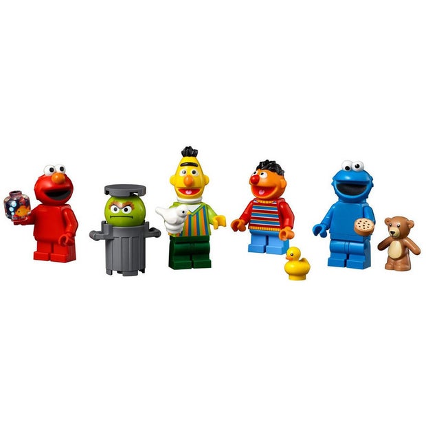 - The set features Elmo, Cookie Monster, Bert and Ernie minifigures, plus Oscar the Grouch and Big Bird figures. Also includes Slimey the Worm, Dorothy the Goldfish, Radar the Teddy Bear and Rubber Ducky figures.