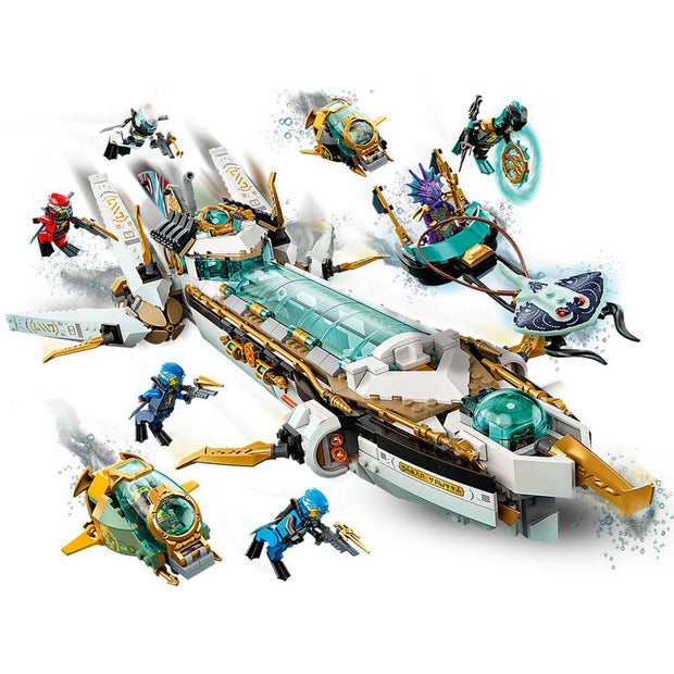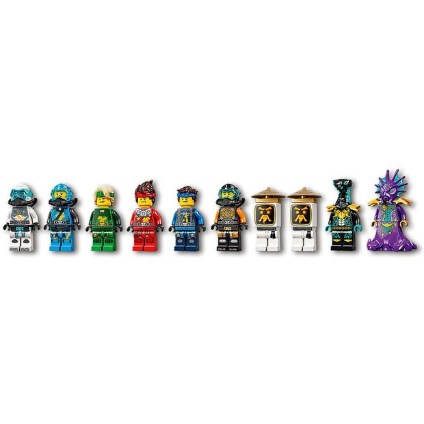 This underwater playset features an impressive 10 minifigures: Scuba Kai, Scuba Nya, Scuba Zane, Scuba Jay, Scuba Cole and Scuba Lloyd, all with flippers, diving gear and weapons to fight the villainous quartet of Prince Kalmaar, a Maaray Guard and 2 Wu Bots.