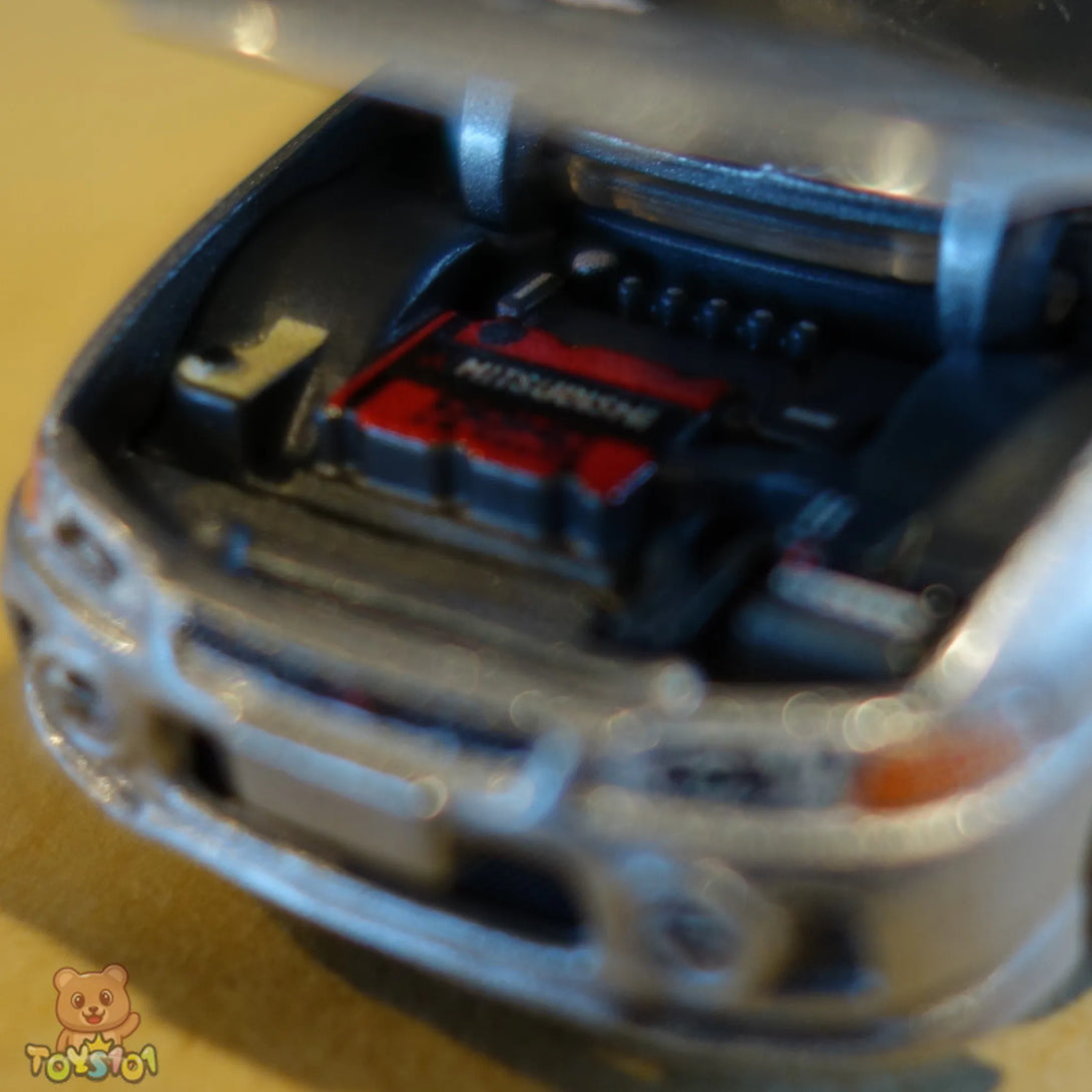 Lift the opening bonnet to reveal a detailed miniature of the turbocharged engine that made the Evo a rally champion. The gold alloy wheels pop against the car’s bodywork, a nod to the motorsport look that set the Evolution apart on road and track.