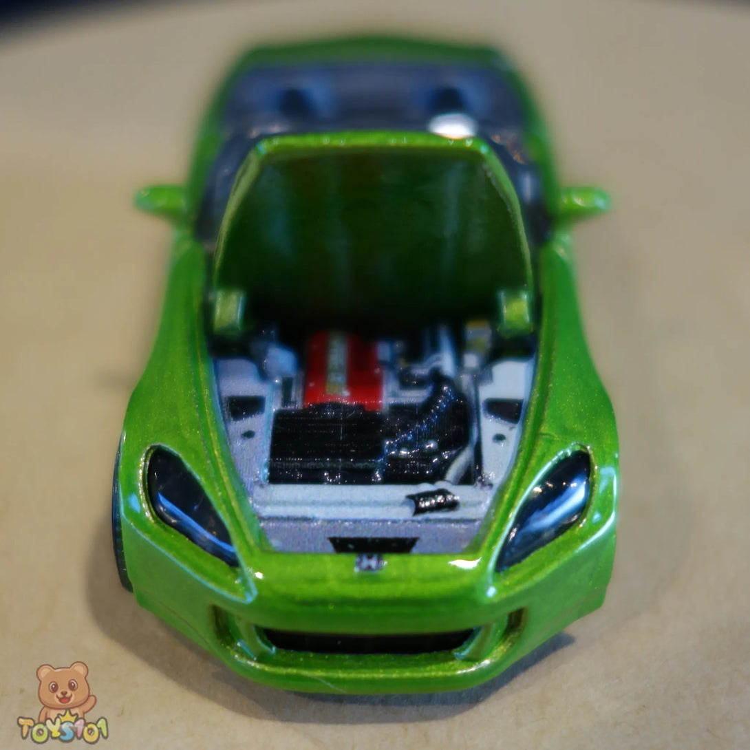Flip open the bonnet to reveal the S2000’s high-revving engine, famous for its 8,000rpm redline and exhilarating performance. The deep green paint finish is rich and refined, bringing out every curve of the car’s timeless design.