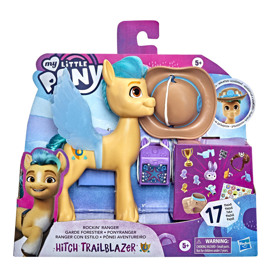 Includes a 6-inch Hitch Trailblazer pony figure with a character-inspired sheriff's badge Cutie Mark on one side. Comes with a sticker sheet for customizing his 16 accessories! Get Hitch Trailblazer ready for 2 unique adventures: rocking super star or outdoor exploring ranger. Imagine he's performing at the Royal Gala, working as a sheriff, or a combination of the 2!
