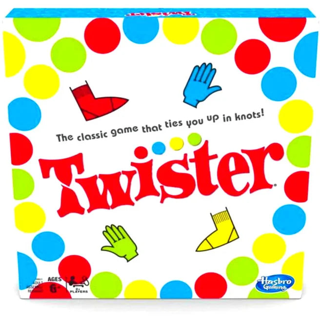 Add a twist of fun into any party or family night with the game that ties you up in knots! This TWISTER game is the classic game with 2 more moves. Give the spinner a whirl and see what's next as you try to keep your hands and feet on the mat! Right foot red! Can you do it? Left foot green. You got it! If your knee or elbow touches the mat, or you fall over, you're out. Be the last player standing to win! TWISTER game challenges you to put your hands and feet at different places on the mat without falling over! Be the last player standing to win. Two new moves! With Spinner's Choice, the spinner makes up a move for the other player to do. Fun Spinner's Choice ideas on the back of the spinner! If the spinner lands on Air, the player must put a hand or foot in the air!